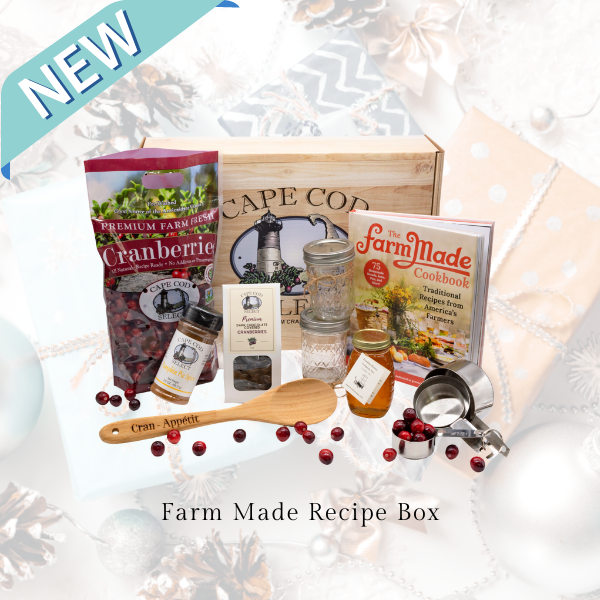 Brand new for the 2023 lineup, The Farm Made Recipe Box! This box is great for those who love to cook! Make your very own cranberry sauce or cranberry chutney with items from the box. This is a great hostess gift for the Thanksgiving host! The box includes 2 lbs of fresh cranberries, Farm Made recipe cookbook (includes 75 recipes from farms across the US, including ours!), two jars for canning, measuring cup set, “Cran-Appetit ” Spoon, 8 oz local honey (Franklin Honey Co.), pumpkin pie spice, and dark chocolate covered cranberries (for a tasty treat while you’re cooking!). Who does this gift remind you of?