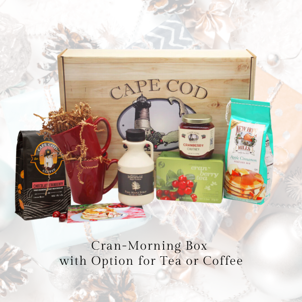Lastly, The Cran-Morning Box! This box is available year round and includes two mugs, your choice of Cape Cod chocolate cranberry coffee or cranberry tea, 10 oz jar of cranberry chutney, apple cinnamon pancake mix, organic maple syrup and recipe card for cranberry apple cinnamon pancakes.