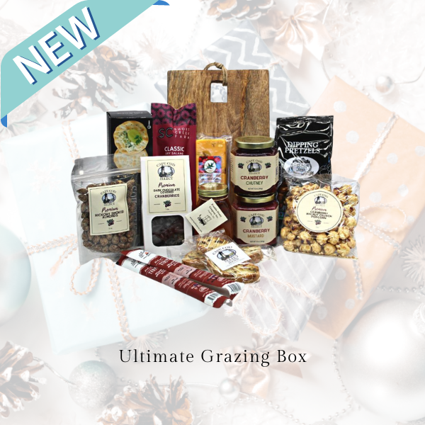 Can’t decide between the charcuterie box and the snack box? You don’t have to! Introducing The Ultimate Grazing Box. This box is loaded with everything you need for the ultimate spread! Box includes wooden board (your choice of “Home” or “Blessed”), 10 oz jar cranberry chutney, 10 oz jar cranberry mustard, pretzels for dipping, two teriyaki meat sticks, salami, cranberry cheddar cheese, 8 oz local honey (Franklin Honey Co.), crackers, hickory smoked almonds, cranberry walnut crunch popcorn, dark chocolate covered cranberries, two cranberry pistachio biscotti, and recipe cards. Pretty ultimate, right?